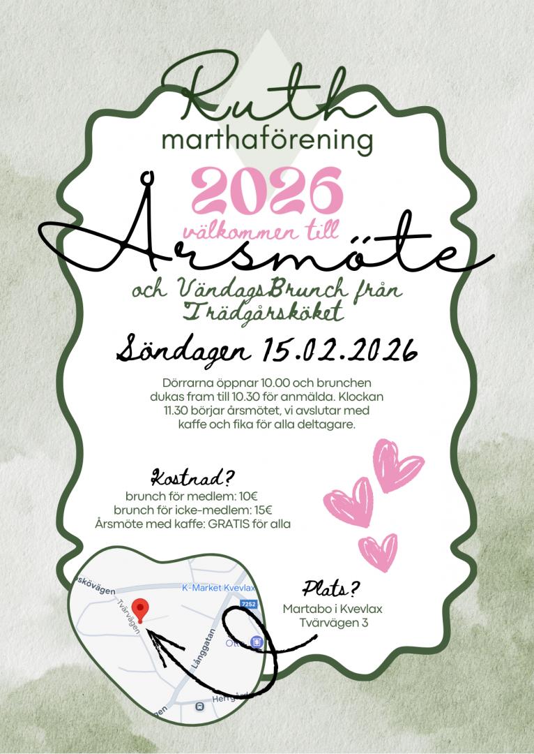 Söndagen 15.02.2026 håller Ruth sitt årsmöte. Varmt välkommen att delta. Före årsmötet finns det möjlighet att delta i en vändagsbrunch från Trädgårdsköket. Själva årsmötet börjar kl 11.30. Anmälan via länken nedan: